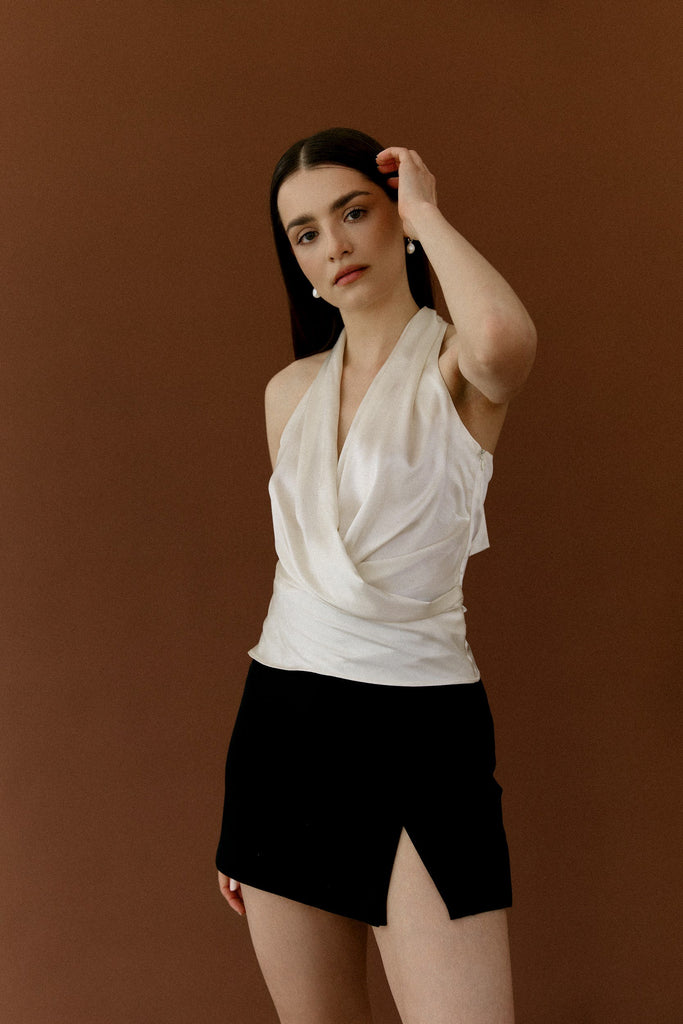 Crafted from luxurious silk, the Camilla Top features a flattering halter neckline that elegantly drapes into a sophisticated cowl. The smooth, flowing fabric enhances its graceful silhouette, providing a chic and polished look. Ideal for both day and evening wear, it adds a touch of understated glamour to any outfit.